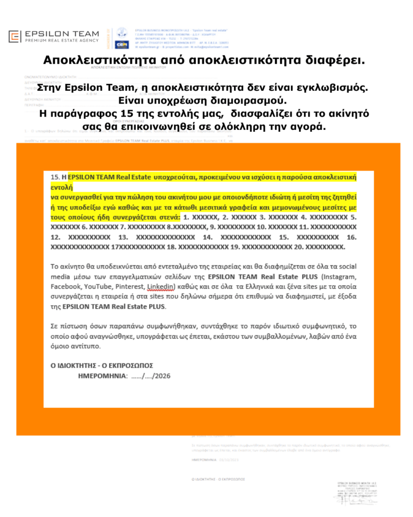 Η αποκλειστικότητα στην Epsilon Team είναι μια στρατηγική επιλογή κύρους και αποτελεσματικότητας. Είναι η δέσμευση ενός επαγγελματία να γίνει ο προσωπικός σας σύμβουλος, να προστατεύσει την εικόνα της περιουσίας σας και να οδηγήσει σε μια επιτυχημένη συναλλαγή με τους καλύτερους δυνατούς όρους.